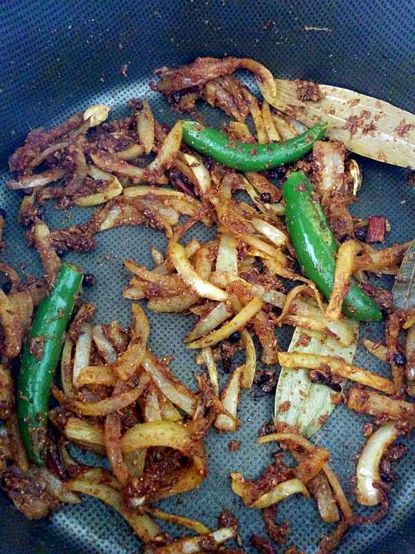 - Fry till onions are cooked and raw smell of ginger garlic paste goes off.