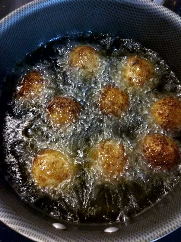 - When the oil is hot enough, drop one by one ball and fry it on the medium flame till golden.